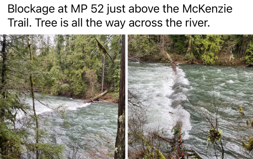Milepost 52 (just above the McKenzie Trail): A tree is down across the entire river, creating a full blockage.